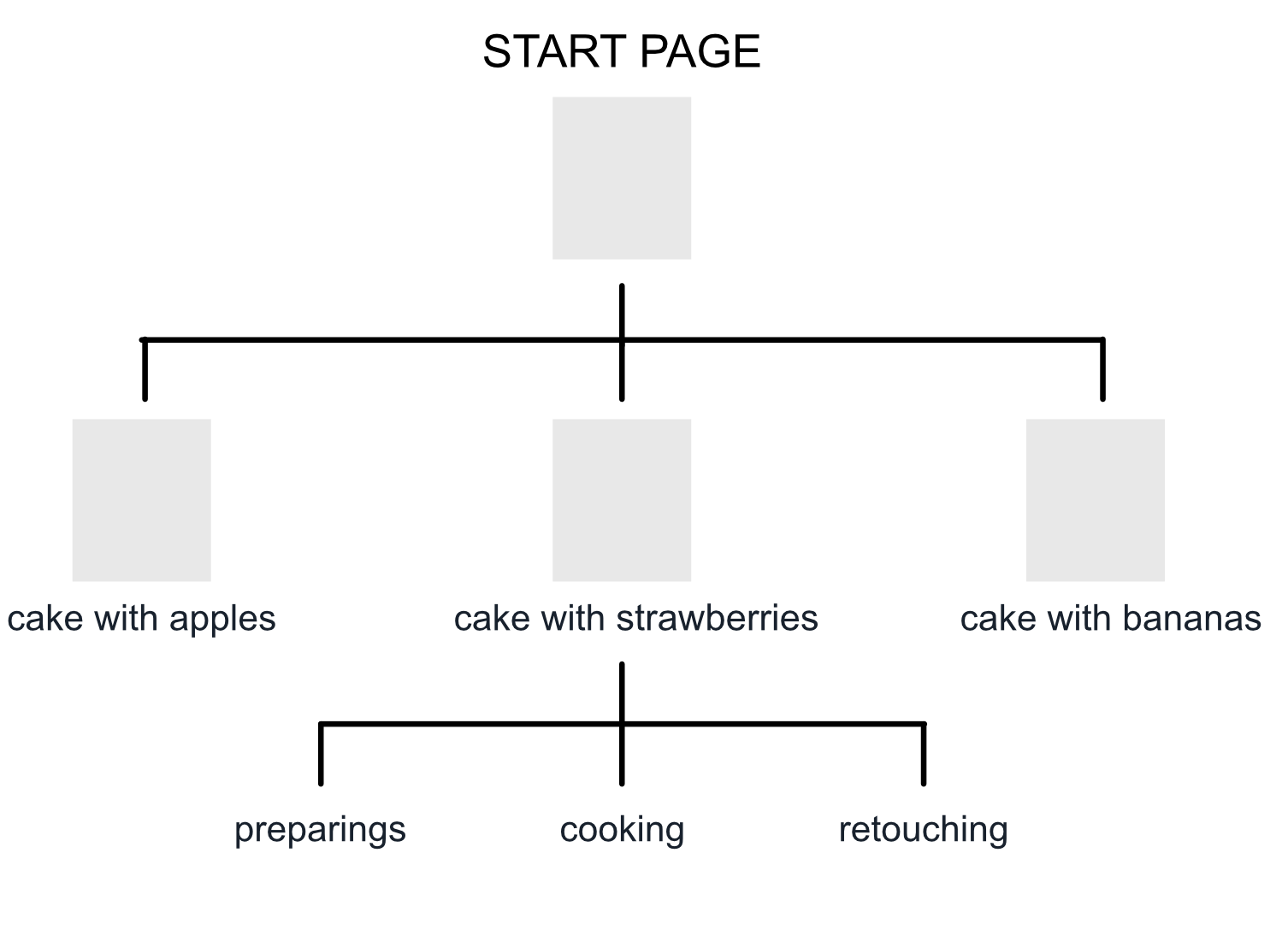 If, for example, we wanted to make a site for making cream cakes, we would have a front page that would mentally represent the beginning of the site, a series of pages that would relate to the various recipes, and “subpages” that would relate to each of those recipes.
