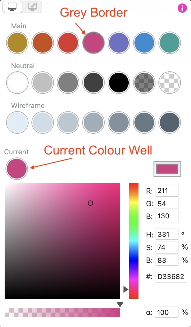 When changing a colour in the colour palette, the colour you’re changing will be highlighted with a grey border. If you don’t want to change the palette colour swatches, just select the object or text that you want to change on the canvas, and then click the CURRENT colour well - this will also be highlighted with a grey border. You will then be able to change the CURRENT colour without it affecting any of the other colours.