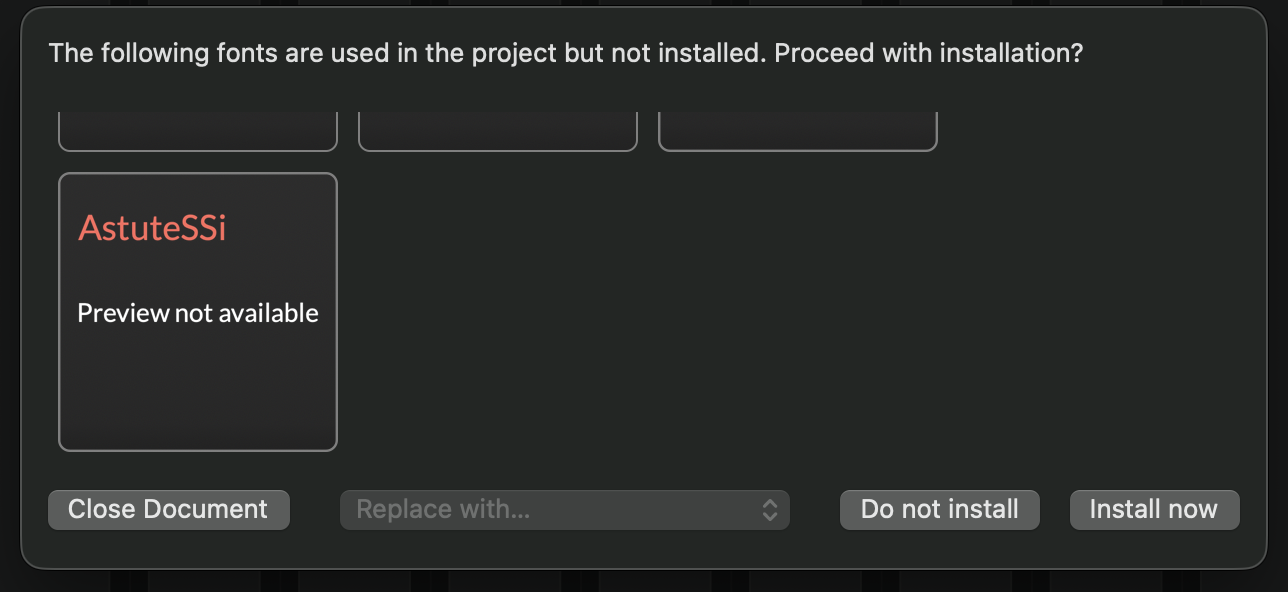 But the font isn’t in the list. If I proceed, the font is replaced; if I don’t proceed, the file will not open.