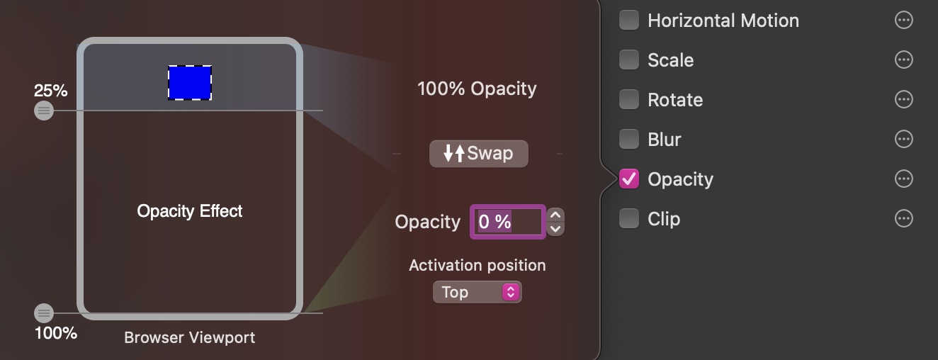 To make the button appear a little after users start scrolling, just add an opacity animation to the button with the following settings.