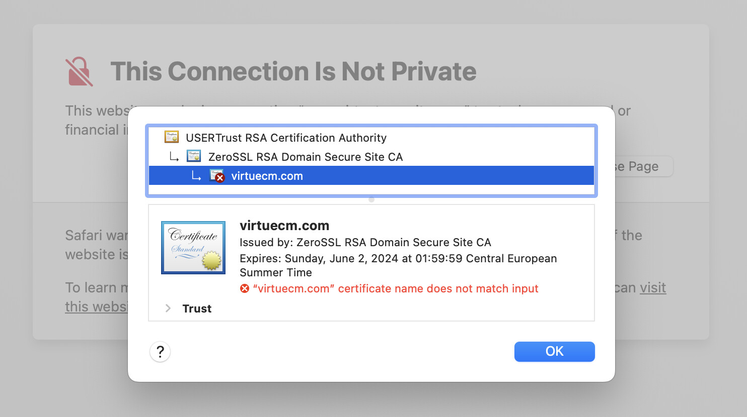 GoDaddy has an incorrect certificate for your domain, the secure site answers with a “virtuecm.com” certificate, this is a security issue, like a different site posing for yours:
