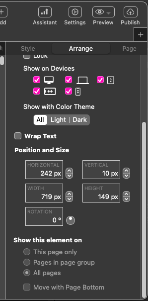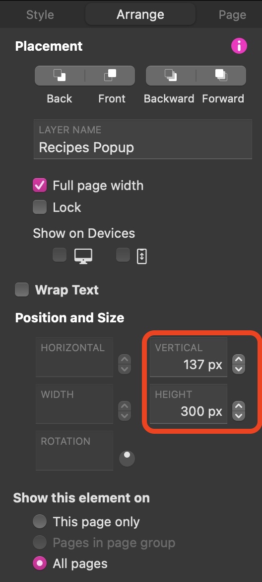 Once the popup is placed on the canvas, you will notice that the placement coordinates are automatically displayed in the Arrange tab.