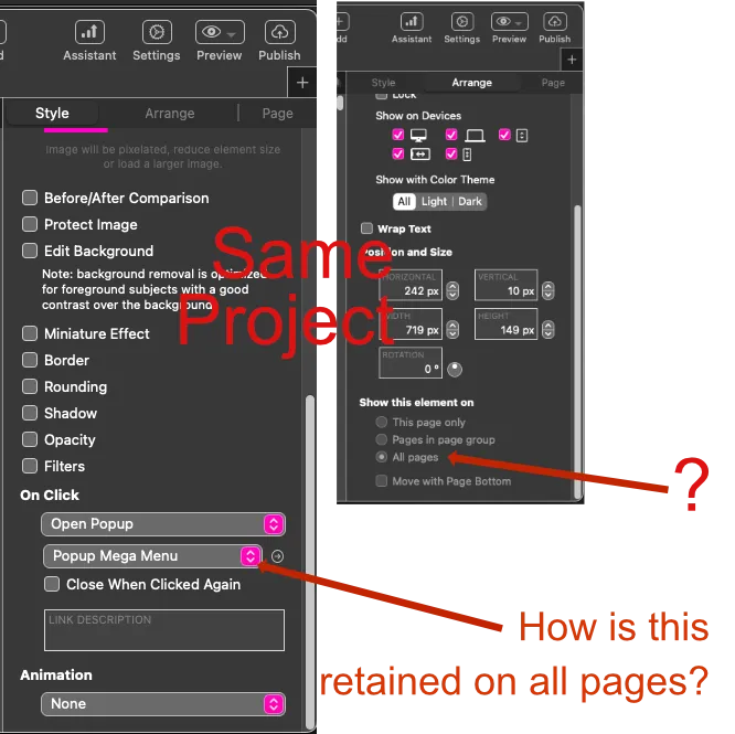 Image below shows two panels with presumed settings. Question: How is the popup menu retained or displayed and kept functional on all 30+ pages? Other pages display just fragments of menu on index-landing page. The Docs, posts, topics-here and vids are all very nice but seeing an image of panels all correctly set for a popup-menu-element would help. Here are screenshots from index page, of what has not as yet worked for all pages: