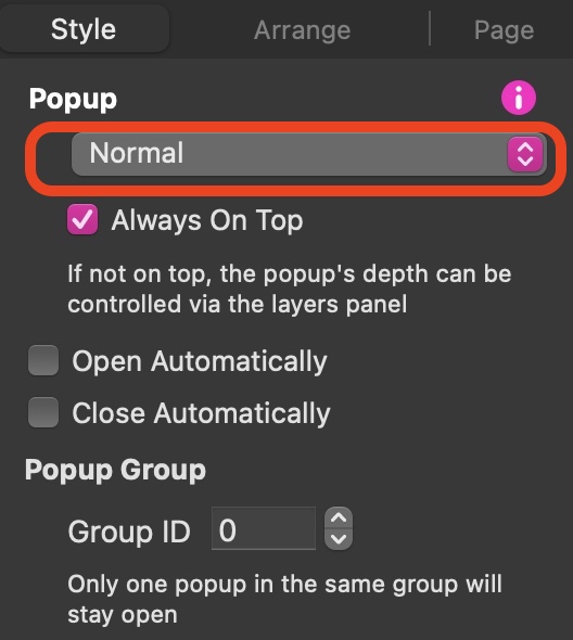 The Popup is often placed manually on the screen - just click and drag the popup to where you want it to appear on the canvas. For this to work, the popup type should be set to Normal.